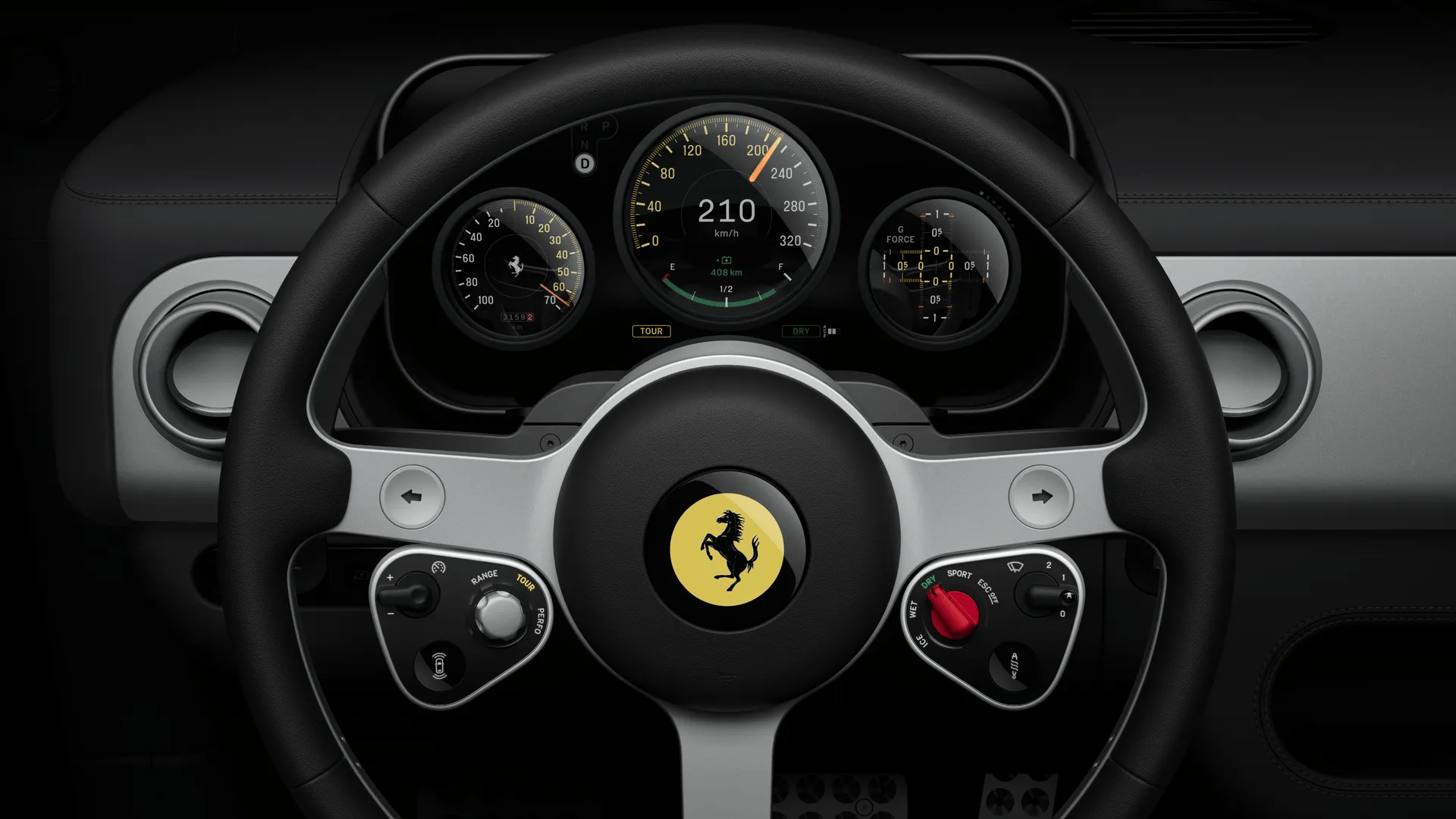 人机交互界面以“触感、清晰、直觉”为核心设计理念。方向盘采用简化三幅结构,灵感源自20世纪50-60年代的木质Nardi方向盘,整体分为两个类似F1赛车的控制模块,重量较标准法拉利方向盘减轻400克。中控台搭载行业首发的彩色E-Ink墨水屏钥匙,插入后屏幕颜色由黄转黑,同步点亮仪表盘与中控屏,营造沉浸式驾驶氛围。实体按键的保留进一步强化了人车互动的直接性。